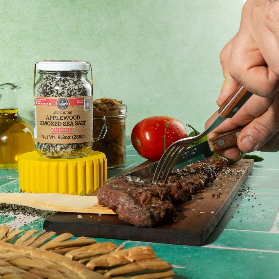 Esta sal es creada a partir de sal de grano, que se ahuma durante 10 días bajo tierra con leña de manzano, se oscurece y toma ese color oscuro característico.
