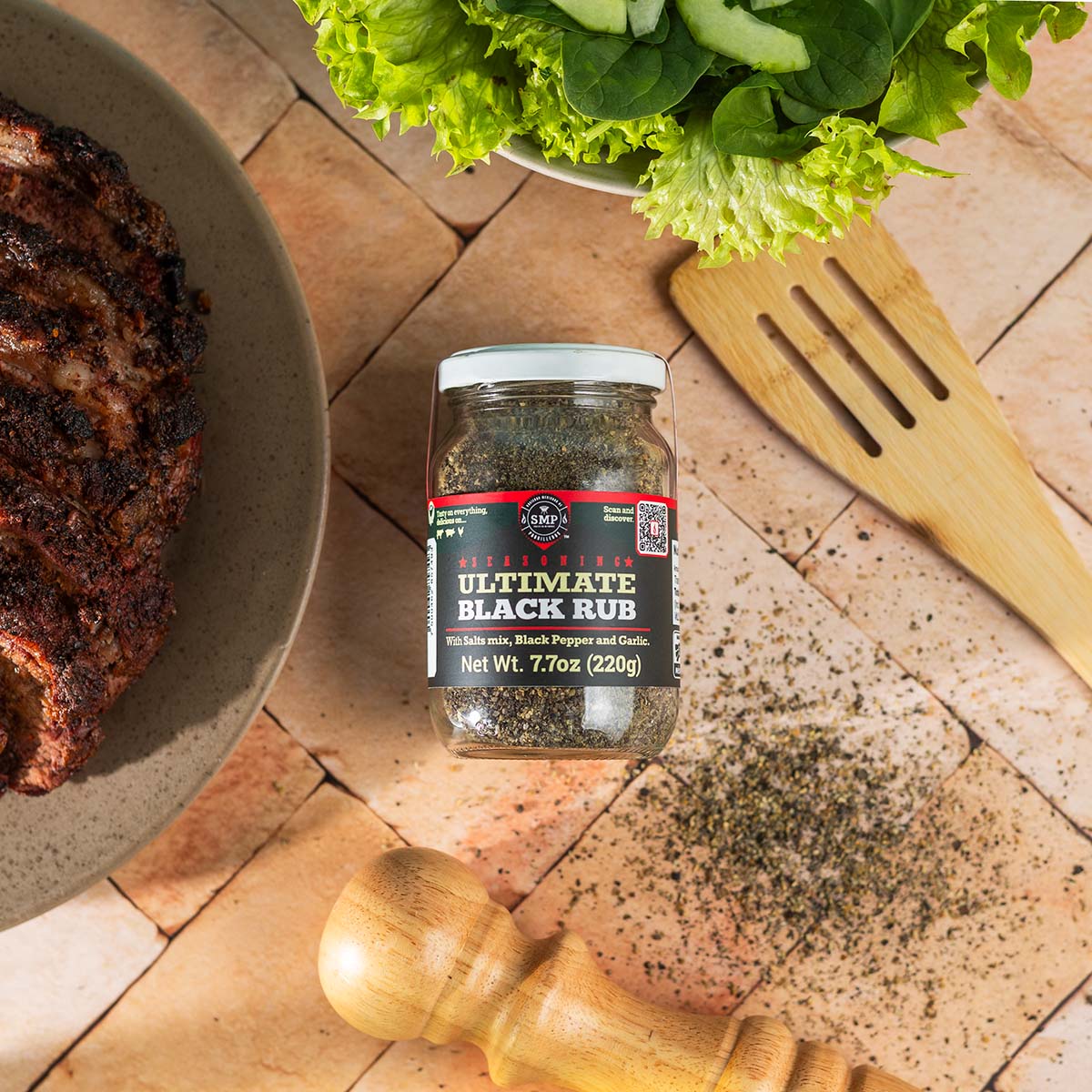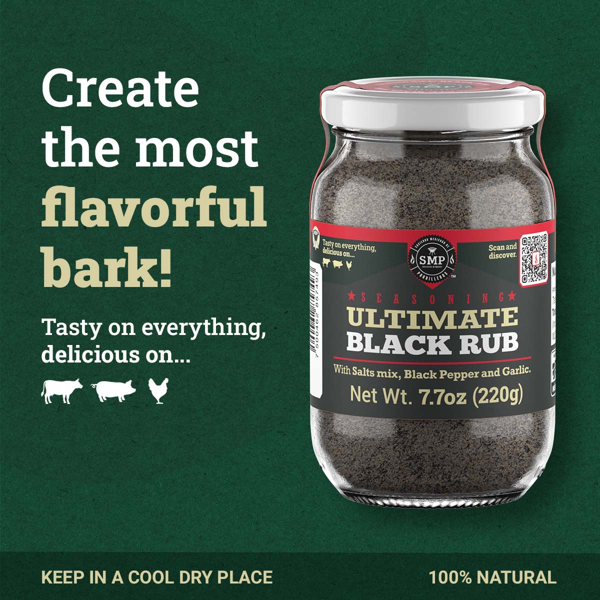 Sal, pimienta negra y ajo son la mezcla principal de especias que se utilizan en la cocina, a esta mezcla le agregamos nuestra sal marina ahumada de madera de manzano para darle nuestro sello de sabor característico. Fija y acentúa el sabor de cualquier corte de carne asado a alta temperatura.