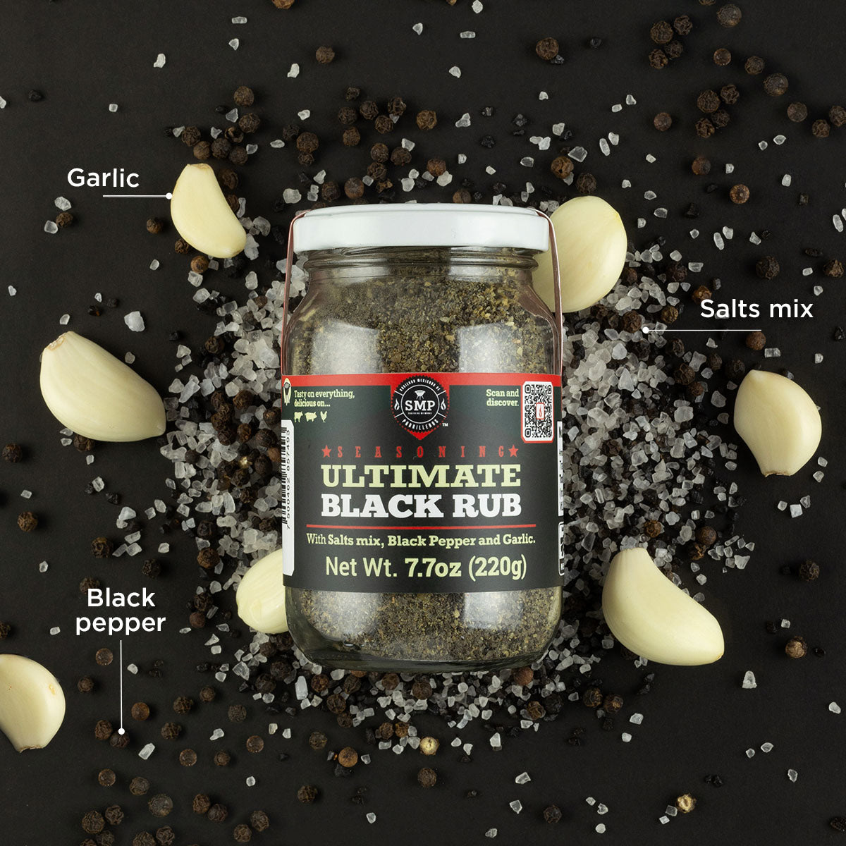 Sal, pimienta negra y ajo son la mezcla principal de especias que se utilizan en la cocina, a esta mezcla le agregamos nuestra sal marina ahumada de madera de manzano para darle nuestro sello de sabor característico. Fija y acentúa el sabor de cualquier corte de carne asado a alta temperatura.