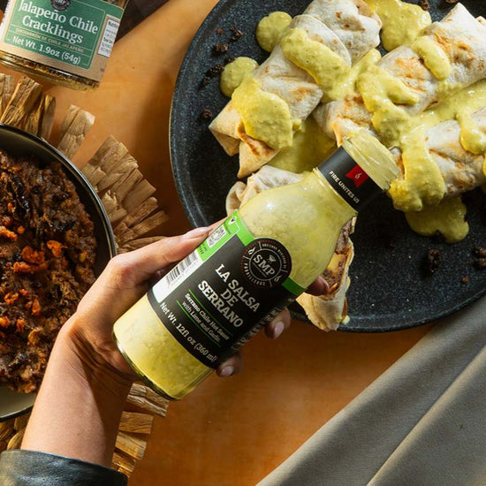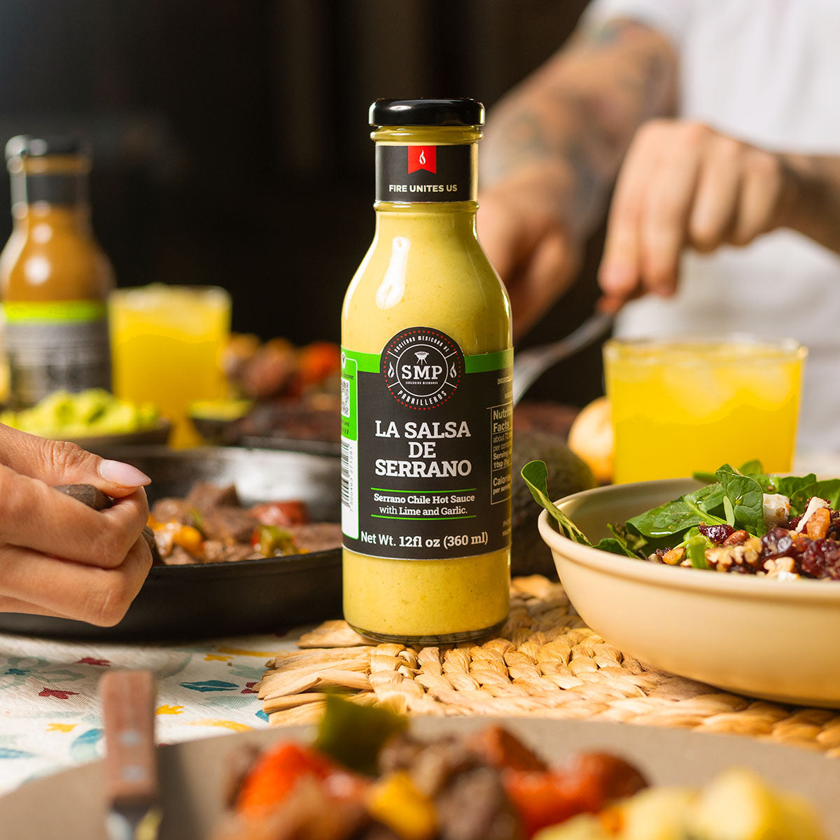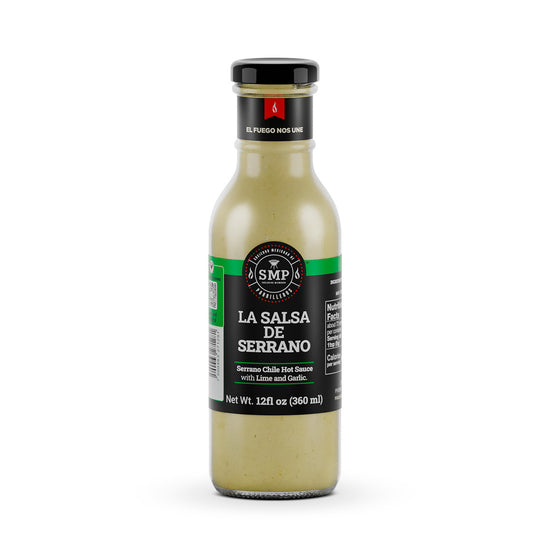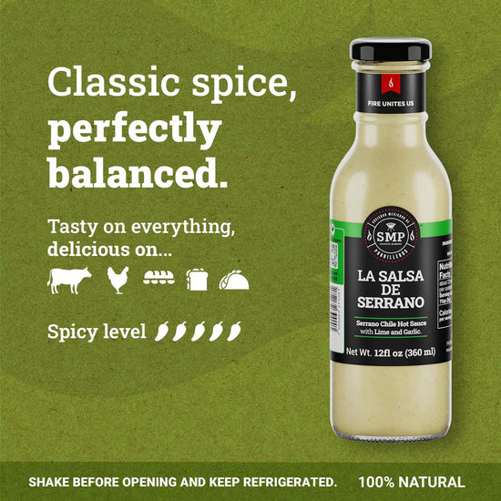 Bring the true taste of northern Mexico to your table. Crafted with fresh chile serrano, garlic, lime, and sea salt, our creamy Salsa de Serrano is the soul of every carne asada, versatile, bold, and a taste of home in every bite.