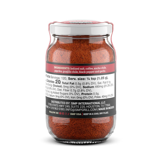 This unique blend combines the base of Rub Rojo with the boldness of coffee, delivering rich, toasted flavors. Ideal for thicker cuts of meat like brisket, pork shoulder, and ribs, it enhances tenderness during slow cooking. For an added depth of flavor, mix it with other SMP BBQ rubs and create an unforgettable taste experience. Perfect for meats that need a special touch.