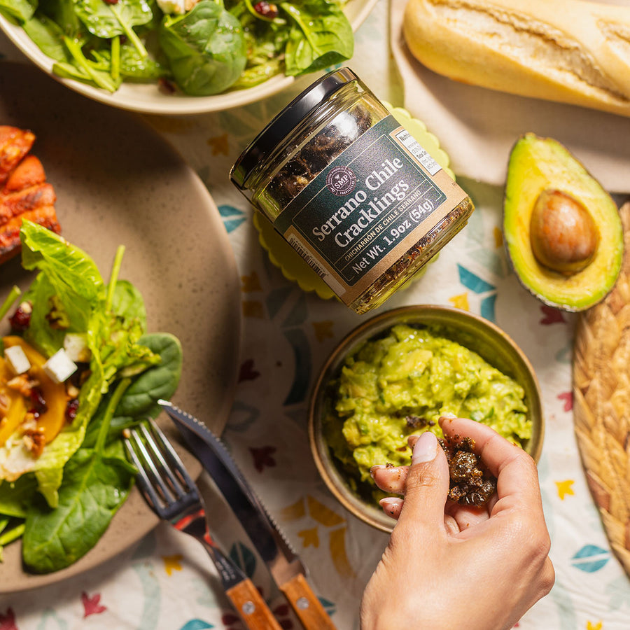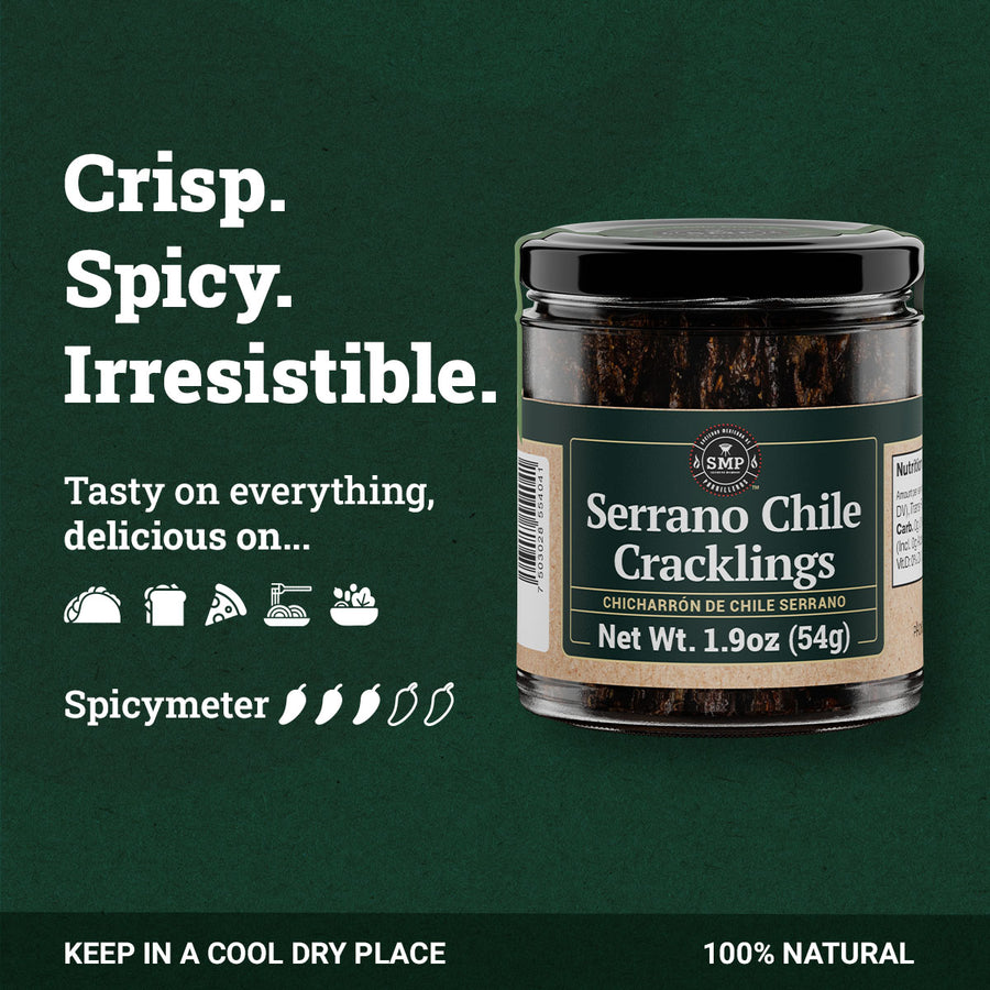 Add a bold, spicy kick to your meals with our Chicharrón de Serrano SMP. Made from fried, dry serrano chiles, it brings texture and heat to any dish. Perfect as a topping for salsas, tacos, or as a crunchy snack on its own. Enjoy it with your favorite snacks or at your next carne asada.